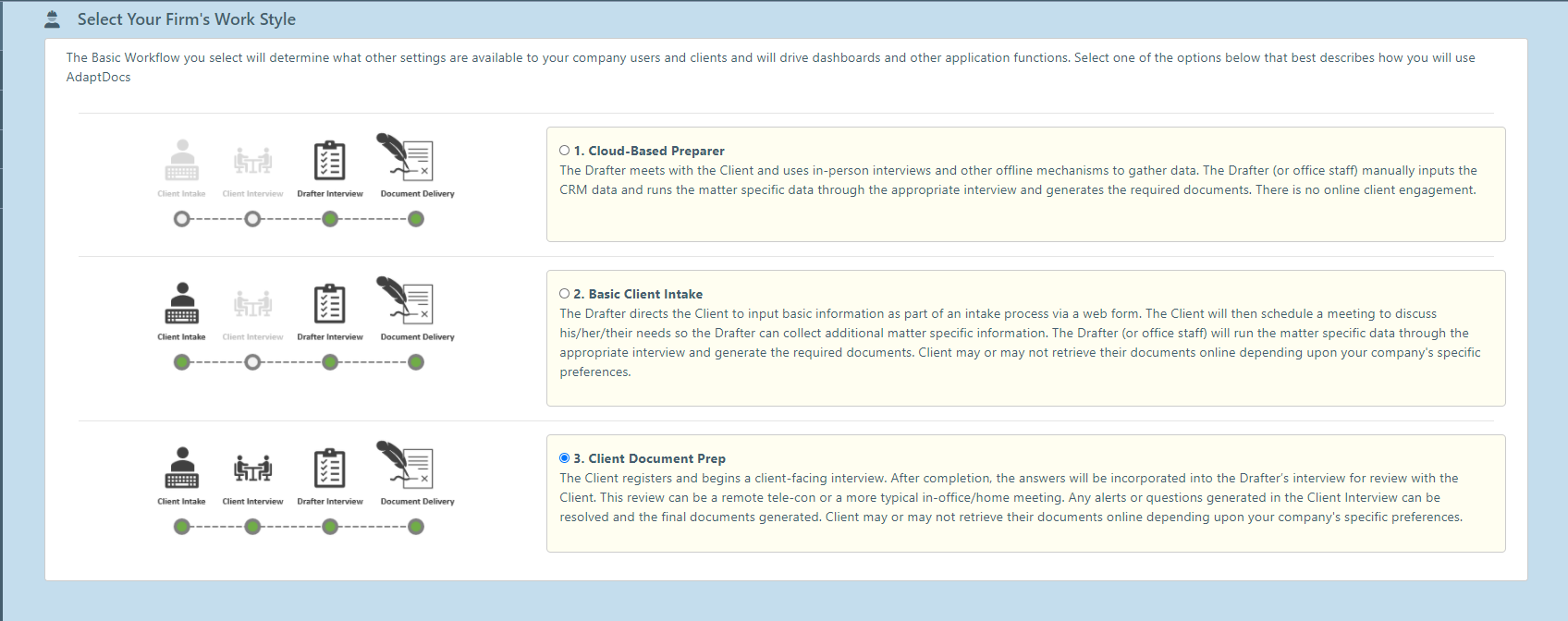 • For example – If you want to accommodate different types of client interactions you can either administer it through your website to accommodate self-service clients as well as meet with full-service clients in person and then complete the interviews to generate more refined documents on your own.